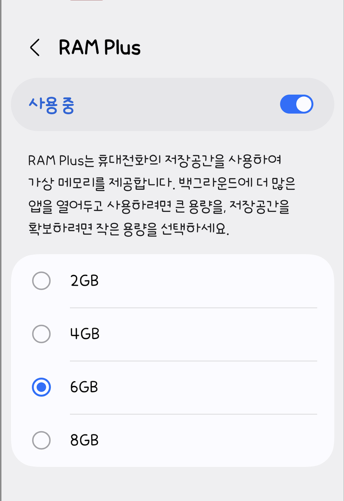 구형폰인 S21 기준으로, 6 GB나 8 GB로 설정하면 처음엔 속도가 괜찮다 느껴지지만,